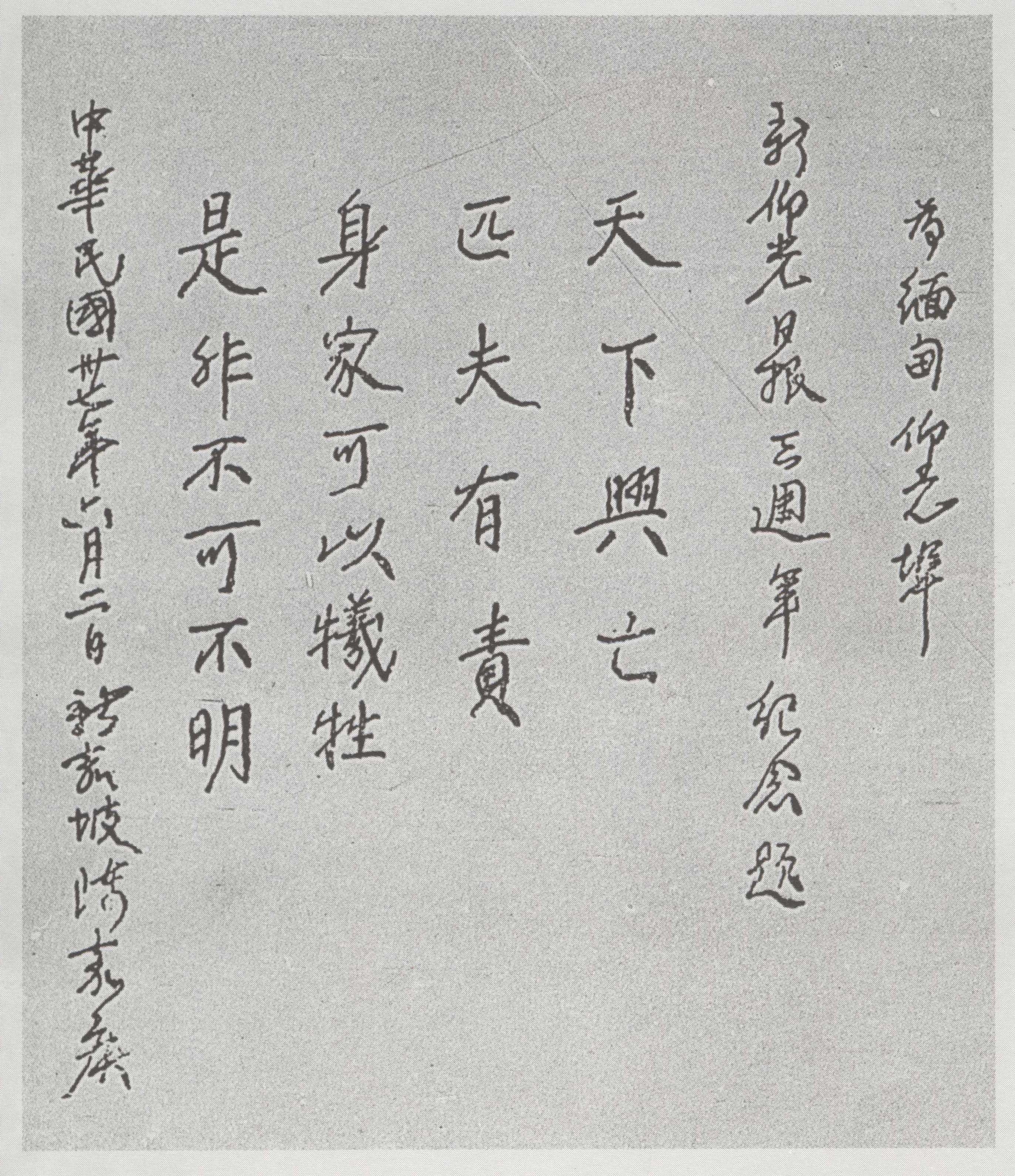 陈嘉庚为缅甸《新仰光日报》创刊三周年纪念题词:“天下兴亡,匹夫有责;身家可以牺牲,是非不可不明。”